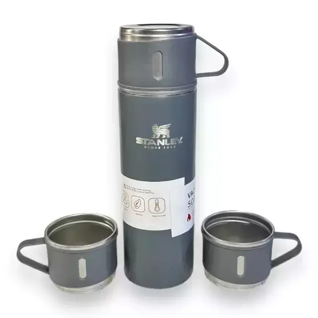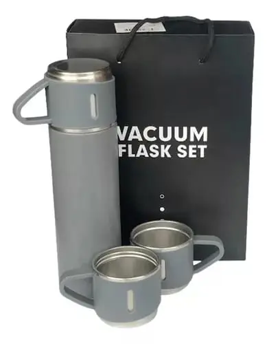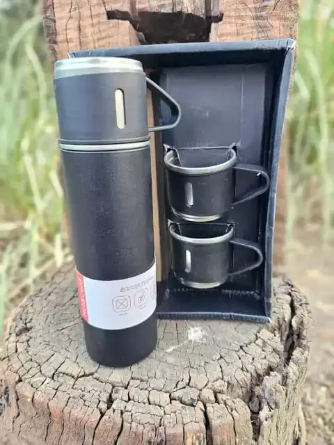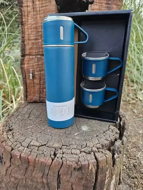 Dos tazas de acero inoxidable: Complementando el termo, estas tazas de estilo clásico están pensadas para compartir. Son igualmente resistentes y conservan la temperatura, asegurando que tu bebida se mantenga caliente mientras la disfrutas. Cuentan con un asa ergonómica que facilita su agarre.